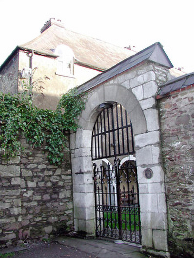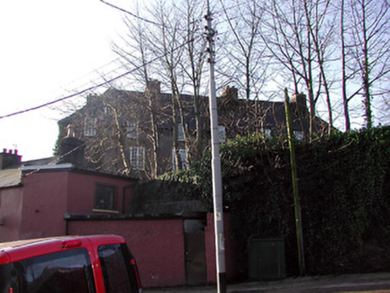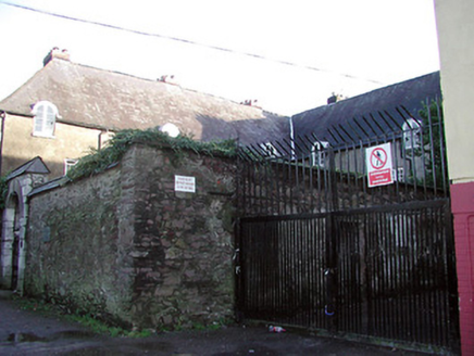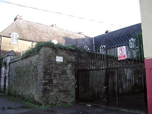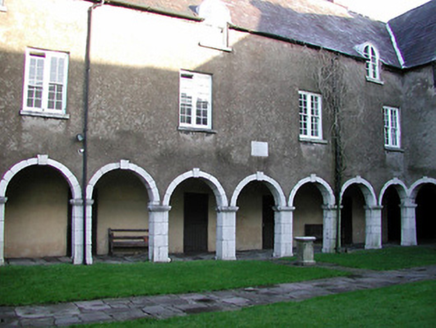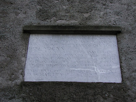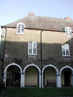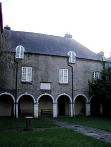 Detached L-plan three- and four-bay two-storey former almshouse with dormer attic, built 1719, with arcade to ground floor. Now in use as flats. Hipped slate roof with round-headed dormer windows and rendered and red brick chimneystacks. Roughcast rendered walls with ashlar limestone dressings to arcade and having pair of carved limestone plaques. Timber sash windows with limestone sills. Timber panelled doors to ground floor. Limestone paving to arcade and to site. Round-headed entrance gate with ashlar limestone walls and having pair of wrought-iron gates. Rubble stone boundary walls to site.