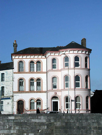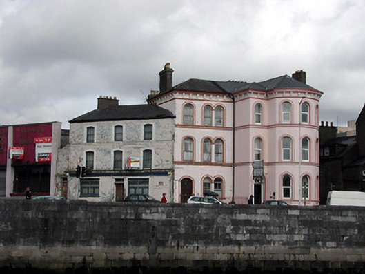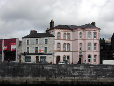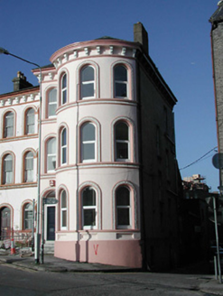 Corner-sited end-of-terrace four-bay three-storey over basement former house, built c. 1860, with full-height projecting bow. Now in use as offices. Rendered walls, with render bracketed eaves course, and decorative string courses at sill levels to upper floors. Round-headed window openings with decorative render surrounds. Round-headed door opening with decorative render surround, timber panelled door, toplight, and limestone steps.