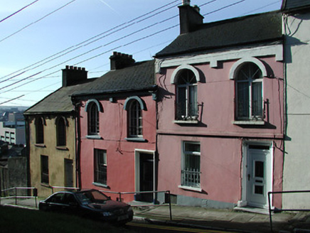 Terraced two-bay two-storey house over basement, built c. 1870, as part of a terrace of three with the adjoining houses to the south. Pitched tile roof with rendered chimneystack. Rendered walls with render platband at eaves course, raised render hood mouldings over first floor openings, and having remains of moulded render door surround. Round-headed window openings to first floor and square-headed window opening to ground floor, with wrought-iron sill guards. Replacement uPVC windows and door. Limestone threshold to front door.