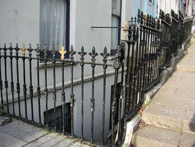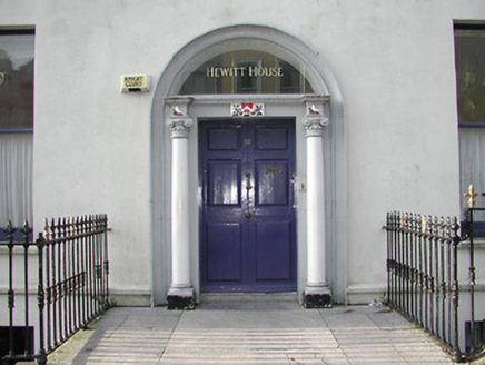 Corner-sited end-of-terrace five-bay three-storey former house over basement, built c. 1820, now in use as school. Hipped and pitched tile roof with rendered parapet and rendered chimneystack. Rendered walls with render cornice, render platbands at sill levels and having render platbands between basement and first floor. Timber sash windows with stone sills. Round-headed door opening with moulded render surround, pair of Ionic columns flanking timber panelled door, and having glazed fanlight above. Cast-iron railings set on limestone plinths, with tooled limestone bridge over basement area leading to entrance door. Nineteenth century Ordnance Survey benchmark carved into limestone plinth at corner of site. Retaining some interior features, such as decorative plasterwork, open well staircase, and timber panelled shutters and doors.