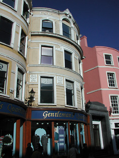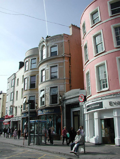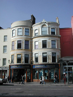 Terraced three-bay four-storey bow-fronted former house, built c. 1800, now in use as retail outlet. Pitched slate roof with rendered chimneystack and moulded render parapet. Rendered walls, with decorative render detail added, c.1910, including string courses, platbands, moulded render surrounds to openings, and plaques. Square-headed openings to first and second floors, and segmental- arched and round-headed openings to third floor. Replacement windows and shopfront, c. 1990.