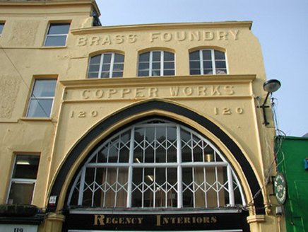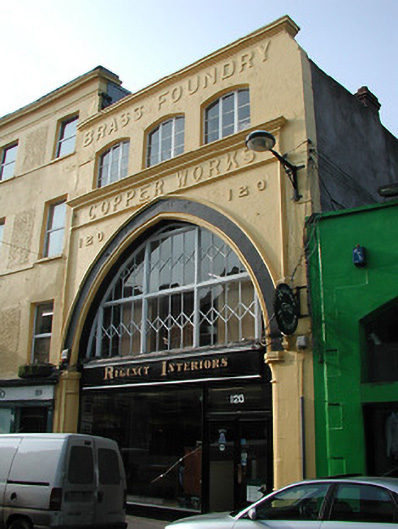 This building makes a striking impression in Oliver Plunkett Street owing to its unusual double-height pointed arch resting on columns of overpainted silver-grey limestone. The raised lettering reading "BRASS FOUNDRY" and "COPPER WORKS" remembers Robert Pulvertaft and Sons which, according to tradition, produced parts for the first Fordson Farm Tractors to roll off the production line at the Henry Ford and Sons plant.