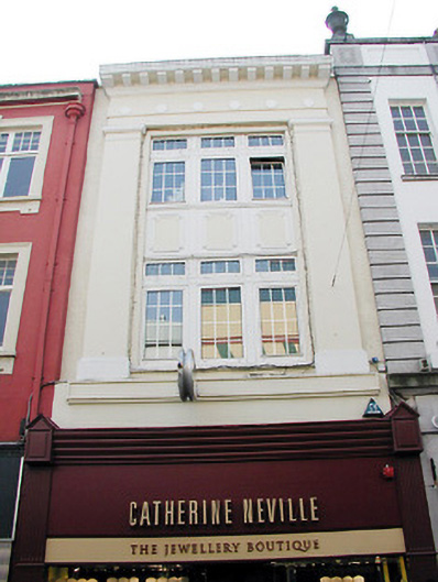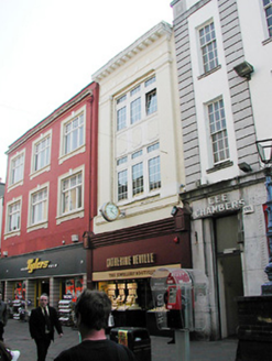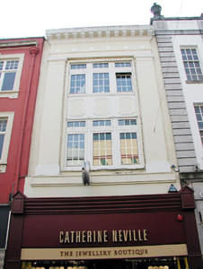 Terraced single-bay three-storey commercial building, built c. 1930, with retail outlet to the ground floor. Hipped slate roof with rendered chimneystack and rendered parapet having moulded eaves course. Rendered walls with double-height pilasters flanking upper floor openings, and having decorative render panels between upper floor openings. Replacement uPVC windows and shopfront, c. 1990.
