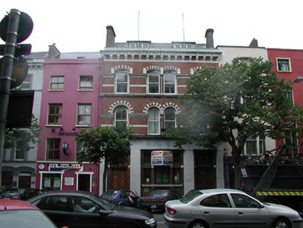 Terraced four-bay three-storey with attic bank, rebuilt c. 1930, using fabric of c. 1865 building, having slate pitched roof, rendered chimney stacks with curved copings, flat roofed dormers, parapet with copper flashing and decorative limestone cornice on consoles, brick façade in Flemish bond with limestone detailing, retaining timber sliding sash windows to first and second floors, with round headed openings to first floor and camber headed openings to second floor, timber panelled entrance doors and overlights with decorative glazing; street frontage.