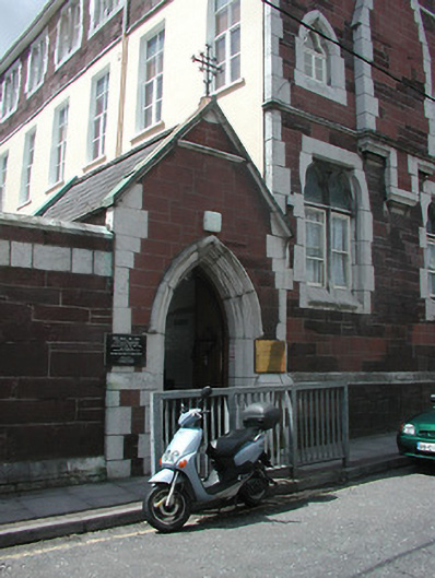 Three-storey convent building, c. 1895, with coupled windows in sandstone and gabled and roofed gateway; on site of Almshouses building; altered and modernised; retaining slate pitched roofs, chimney stacks articulated with limestone dressings, painted render finish to side elevation and square sandstone ashlar with limestone dressings, limestone plinth course and quoins and moulded limestone eaves to rest, paired timber sliding sash windows with sandstone relieving arches and limestone dressings, trefoil detail to ground floor openings, and pointed arched opening to gateway; part of convent complex.