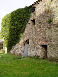 This building, with its regularly spaced windows and unadorned walls, is more typical of a watermill or warehouse. It is distinguished by its round-headed doorways, front and back, with tooled voussoirs and rubble sandstone voussoirs, which give the building an individual character emphasized by its large scale. The coursed rubble stone walls of Barrymore Barn reflect those seen though out the village and this building helps to contextualise its architecture, introducing a quasi-industrial element to the otherwise domestic or small-scale commercial streetscape, and forming the foreground for the ruined castle behind.