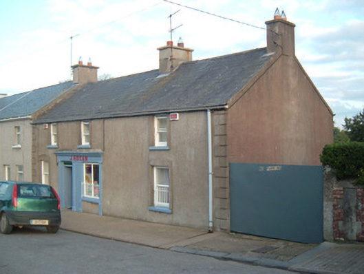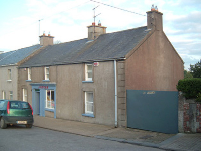 End of terrace three-bay two-storey house, built c. 1880, with shopfront to ground floor. Pitched slate roof with rendered chimneystacks. Rendered walls with render quoins. Square-headed window openings with raised render surrounds, painted tooled stone sills and one-over-one pane timber sliding sash windows. Timber shopfront comprises moulded cornice and fascia with painted lettering, supported on fluted Doric-style pilasters and having square-headed divided display window. Wrought-iron bars to southern two windows of ground floor. Square-headed door opening with double-leaf timber battened outer doors having overlight, and half-glazed timber panelled inner doors, latter with brass bars.