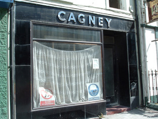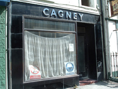 The black Bakelite shopfront is a particularly notable feature of this building. Bakelite, invented in 1909, is a manmade resin that looks like black glass and was frequently employed in early to mid-twentieth-century buildings. Cagney's shopfront employs streamline shapes and juxtaposes manmade bakelite with natural chrome. This shopfront is a rare survivor from this period.