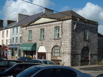Corner-sited three-bay two-storey market house, dated 1769, having lower two-storey extension to rear, built c. 1850. Now disused. Hipped artificial slate roof with terracotta ridge tiles. Rendered pediment over windows of front façade. Slated hipped roof extension, having lead and render ridging and some cast-iron rainwater goods. Dressed limestone walls to front and south elevations, having punch-dressed stones to first floor and tooled stones to ground floor, with tooled limestone string course and raised stone quoins. Smooth rendered façade to rear extension. Arcaded ground floor comprising tooled limestone imposts and voussoirs, latter with projecting dropped keystones, having dated keystone to centre arch. Arches now filled in with replacement timber door and windows. Square-headed window openings to rear extension, having one-over-one pane timber sliding sash to ground floor south-east elevation and six-over-six pane timber sliding sash window to first floor north-east elevation. Limestone steps to south elevation with cast-iron railings. Limestone steps to south-east.
