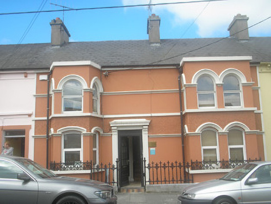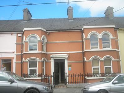 Terraced three-bay two-storey former house, built c. 1880, with two-storey box-bay and canted-bays to front elevation. Now in use as office. Pitched slate roof with rendered chimneystacks, cast-iron rainwater goods and render eaves course. Painted smooth rendered walls with render plinth course and moulded render impost courses to each floor and with render sill course to first floor. Replacement uPVC windows. Slightly pointed round and segmental heads to box-bay windows, having render hood-mouldings and continuous sills. Round and camber-headed window openings to canted bay. Square-headed door opening with replacement timber door, flanked by render fluted pilasters with console brackets supporting cornice. Decorative cast-iron railings to cut limestone plinth to front of building.