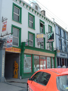 Attached four-bay three-storey former house with integral carriage way, built c. 1820, with timber shopfront to ground floor, and having pitched roofed extension to the rear. Now disused. Pitched slate roof with rendered chimneystack and rendered parapet having central pediment with inset clock and with panelled piers terminating parapet. Decorative render bracketed eaves course, with moulded string course below, and cast-iron rainwater goods. Rendered walls with render quoins at north end of façade at ground floor. Square-headed openings with moulded render surrounds and replacement uPVC windows, having render floral motifs in corners to upper floors. Timber shopfront comprising fascia with carved console brackets and dentillated cornice, panelled pilasters with dentils and swag-motifs to capitals, and panelled stall risers. Replacement timber windows and doors. Square-headed carriageway having limestone wheel guards.