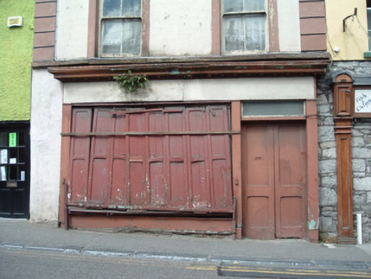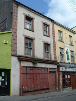 Attached two-bay three-storey former house, built c. 1860, now disused, with timber shopfront to ground floor. Pitched roof with render eaves course and rendered chimneystack. Painted lined-and-ruled rendered walls with render quoins to upper floors. Square-headed openings with two-over-two pane timber sliding sash windows with render surrounds having render keystone detail. Limestone sill course to first floor and concrete sills to top floor. Shopfront comprising timber pilasters to square-headed double-leaf timber panelled door with overlight and timber display window with panelled timber shutters, having fascia and moulded cornice above.