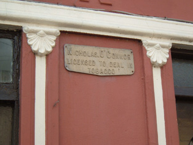 Terraced four-bay two-storey house with integral carriage arch, built c. 1850, having vacant retail outlet to ground floor with render shopfront. Pitched slate roof having rendered chimneystacks and some cast-iron rainwater goods. Painted rendered walls having painted render quoins. Metal plaque and former post box to front elevation. Square-headed window openings having painted moulded render surrounds and one-over-one pane timber sliding sash windows and painted limestone sills. Square-headed door opening accessing house, with replacement timber door. Segmental carriage arch opening having double-leaf timber battened doors. Shopfront comprises panelled pilasters with decorative floral details, fascia with render lettering, decorative moulded cornice with ornate consoles to ends having human masks. Plate-glass display window and double-leaf timber panelled door.