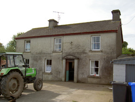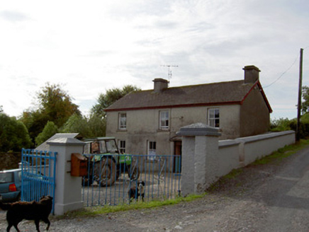 Detached two-storey house, built c. 1800, having three-bay first floor and four-bay ground floor, with segmental-headed windbreak to entrance. Pitched slate roof with rendered chimneystacks, ridge capping, cast-iron rainwater goods, timber bargeboards and timber eaves course. Roughcast rendered walls to first floor, smooth rendered to ground floor. Square-headed window openings with concrete sills and two-over-two pane timber sliding sash windows. Square-headed door opening with timber panelled door and glazed overlight, set into rendered windbreak having render segmental-headed pediment with pebbledashed decoration. Single-bay outbuilding to south-east with pitched corrugated-iron roof, coursed sandstone walls and timber battened door. House set at right angles to road, with rendered boundary walls having square-profile rendered piers to entrance with decorative wrought-iron double-leaf gate and more recent cast-metal railings.