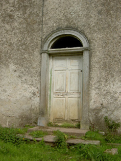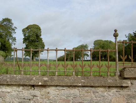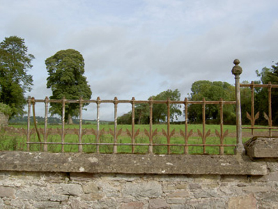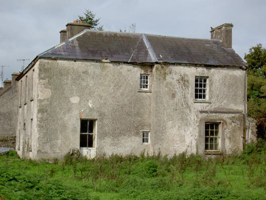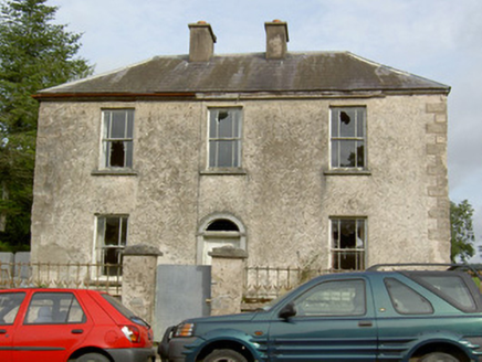 Detached L-plan three-bay two-storey house, built c. 1870, now disused, having slightly projecting east side elevation with irregular fenestration. Hipped slate roof, pitched to return, with rendered chimneystacks. Rendered walls with margined render quoins, having dressed and tooled limestone quoins beneath, where render gone. Square-headed window openings with cut limestone sills, having margined one-over-one pane timber sliding sash windows to front elevation and one-over-one, two-over-two, six-over-three pane and six-over-six pane timber sliding sash windows to east elevation. Round-headed door opening to front elevation, with timber panelled door, cut limestone steps and carved limestone surround comprising pilasters with Ionic-style capitals and moulded architrave. Rubble limestone walls with concrete copings surmounted by decorative cast-iron railings with decorative cast-iron posts between runs of railing. Rendered square-profile piers to pedestrian gate, with cast-iron gate and limestone step. Remains of ruinous outbuildings to rear.