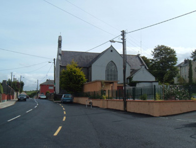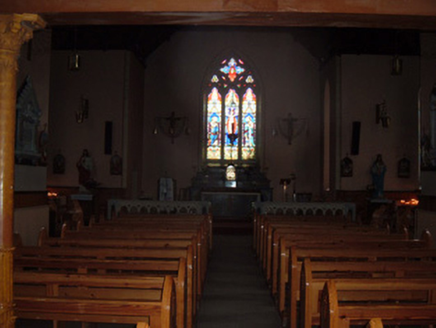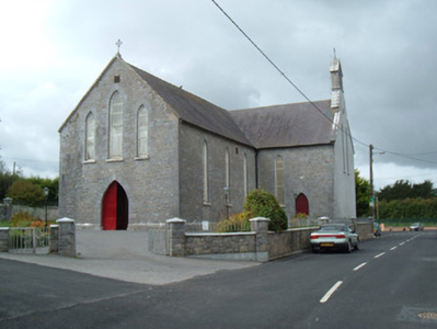 Freestanding north-east-facing gable-fronted cruciform-plan Roman Catholic church, dated 1869, with single-storey pitched roof sacristy to south-west corner. Pitched slate roofs having cast-iron rainwater goods, and render copings and cross finials to gables. Coursed rubble limestone walls to nave and to front elevations of transepts, with ashlar limestone quoins and plinth course, and painted rendered walls elsewhere. Lancet windows to nave and front elevations of transepts, triple to gable-front and double to transept gables, all with tooled limestone surrounds and latticed glazing. Pointed triple-light window opening to altar end, having tracery and stained glass. Pointed arch door openings to gable-front and to front elevations of transepts, having double-leaf timber battened doors and tooled limestone surrounds. Interior has tiled floor under carpet, with marble altar rail, metal Stations of the Cross and timber battened organ gallery supported on columns with decorative capitals. Recent boundary wall to site.