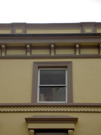 Attached three-bay three-storey over half-basement former house, built c. 1820, with attic and having shopfront to east end of façade and and flat-roof single-bay two-storey and lower pitched slate two-bay two-storey additions to rear. Now in use as offices. Pitched slate roof with rendered chimneystack and cast-iron rainwater goods. Moulded render cornice supported on decorative render bracket course with moulded string course beneath and having rendered parapet with panel details. Painted rendered walls to front and south gable with render quoins broken by moulded render sill courses having decorative course of roundels beneath. Roughcast render to north gable and smooth unpainted render to rear. Carved limestone plaque to ground floor with render surround. Square-headed openings with one over-one-pane timber sliding sash windows and moulded render surrounds to second floor and one ground floor window, those to first floor having render pilasters with plinths and decorative consoles supporting moulded render cornices. Square-headed openings to attic windows in gable ends with timber casement windows. Window openings to rear have mainly replacement uPVC windows, but with one six-over-six pane timber sliding sash window to rear wall and two-over-two pane window to return. Round-headed door opening to façade with concave render surround having decorative render keystone, square-headed timber panelled door, render architrave, carved timber Ionic-style columns, decorative frieze, dentillated cornice, and elaborate scrolled fanlight. Approached by flight of splaying cut limestone steps with decorative cast-iron railings. Shopfront comprises square-headed opening with one-over-one pane timber sliding sash window and concrete sill and square-headed entrance with defunct timber panelled door having overlight. Render fascia and moulded cornice suppported on decorative render console brackets. Decorative cast-iron railings to each side of approach to this doorway, to front of this doorway and to basement area with dressed limestone plinth to front of building, and rubble stone boundary wall to south-west, along lane.