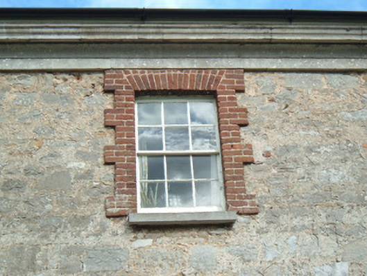 Terraced three-bay two-storey over basement house, built 1777, as part of scheme of almshouses. House is eastern subdivision of former five-bay house. Hipped slate roof with carved limestone cornice, rendered chimneystacks, terracotta chimney pots and some cast-iron rainwater goods. Rendered coursed limestone walls with chamfered quoins and plinth course, and painted walls to basement. Camber-headed window openings with timber sliding sash windows, six-over-six pane to first floor and nine-over-six pane to ground floor with red brick block-and-start surrounds and limestone sills, and square-headed window opening to basement, having nine-pane fixed timber window with limestone sill and brick voussoirs. Former round-headed door opening of original house now in use as window, having six-over-six pane timber sliding sash window with spoked fanlight, rendered infill below, and carved limestone Gibbsian doorcase with triple keystone. Camber-headed door opening in use having timber panelled door, eight-pane timber overlight, red brick block-and-start surround and limestone steps over area. Rendered boundary wall to site with limestone coping.