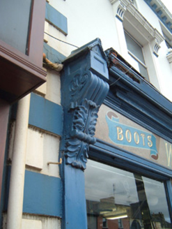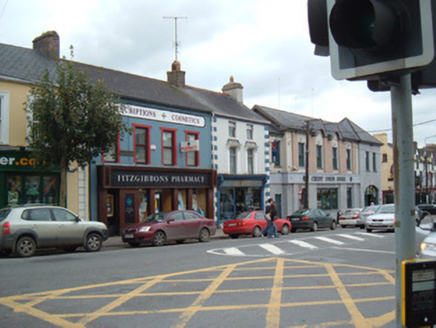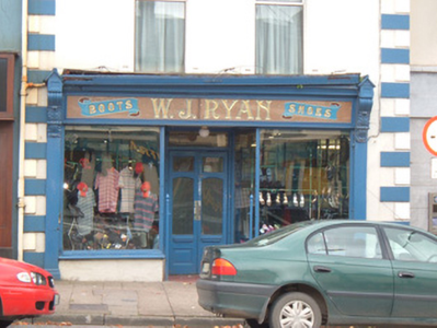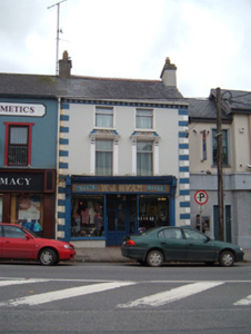 Attached two-bay three-storey house and shop, built c. 1880, with shopfront to ground floor. Pitched slate roof having rendered chimneystacks, clay chimneypots, some cast-iron rainwater goods and painted render corbelling to eaves. Painted rendered walls having painted render quoins. Square-headed window openings to upper floors, having replacement aluminium windows, top floor having painted render sills. Painted render pilasters, brackets and moulded cornices to first floor windows, surmounted by painted render floral motifs. Shopfront to ground floor having pilasters to each end with plinths and scroll consoles with foliate decoration and having gabled caps. Timber-framed plate-glass display windows with moulded sills and render stall risers, flanking recessed shop entrance with tiled floor and metal piers for gates, and half-glazed double-leaf timber panelled door with overlight. Marble fascia with gilt lettering and moulded timber cornice.