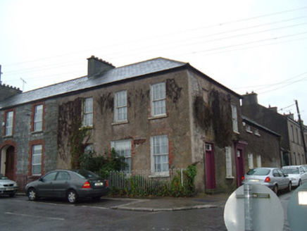 Corner-sited end-of-terrace three-bay two-storey house, built c. 1800, with two-bay side elevation to King Street, having entrance doorways. Slightly lower return to rear, and lower two-storey pitched roof wing to side elevation. Hipped artificial slate roof with rendered chimneystacks and uPVC rainwater goods. Rendered coursed limestone walls. Square-headed window openings having timber sliding sash windows, six-over-six pane with painted sills to side elevation, and margined timber slidings sash windows to main elevation, four-over-four pane except for middle bay of ground floor which is six-over-six pane, with rendered brick surrounds and painted sills. Recent timber windows to wing. Blind square-headed window opening to side elevation. Square-headed door openings, eastern having double-leaf timber battened door with overlight, timber lintel, brick retaining arch, and limestone steps, and western having timber panelled door with decorative overlight and painted timber surround comprising panelled pilasters with plinths and having moulded frieze and cornice. Gateway to rear yard flanked by square-profile tooled cut limestone piers having limestone caps and recent timber battened gates with cast-iron detailing. Wrought-iron railings to front of main elevation of building.