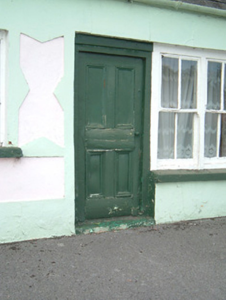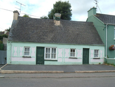 Attached six-bay single-storey house, built c. 1860, formerly pair of three-bay houses. Pitched artificial slate roof with painted rendered chimneystacks and cast-iron rainwater goods. Painted rendered walls with decorative scheme incorporating eaves and plinth and having decorative panels flanking openings. Square-headed window openings with two-over-two pane timber sliding sash windows, double to western half, with painted stone sills. Square-headed door openings with timber panelled doors.