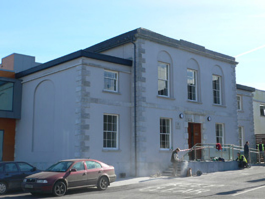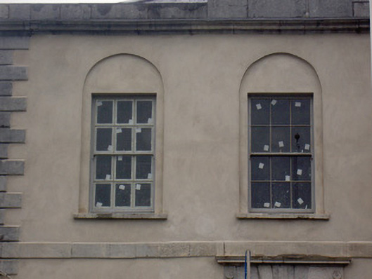 Built by John Anderson, founder of Fermoy, and Archibald Grubb, the form and style of this courthouse are characteristic of such buildings of their era. It employs a restrained classicism, which lends the structure an air of authority. Symmetry is maintained throughout the design and is heightened by features such as the recessed panels, platbands articulating storeys, the central stepped pediment and the raised quoins. The central focus of the building is the elaborate doorcase, the Gibbsian style of which adds elegance to the façade. The building occupies a prominent site closing the vista from Patrick Street and stands on a wide site.