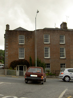 Corner-sited end-of-terrace three-bay three-storey over half-basement house, built c. 1840, as a terrace with the adjoining houses. Now also in use as offices. North end bay recessed although projecting to rear elevation, and middle bay has rounded corner. Two-bay two-storey return to rear. Hipped slate roofs with rendered chimneystacks. Red brick parapet having dressed limestone coping. Flemish bond red brick walls with dressed limestone quoins. Rendered walls to basement and to other elevations. Square-headed window openings with render reveals, cut limestone sills, and six-over-six pane timber sliding sash windows, having brick voussoirs to front elevation. Segmental-arched door opening with brick voussoirs and limestone step. Timber panelled door set into timber doorcase comprising carved fluted engaged columns and architrave, with stained-glass sidelights having panelled risers, and fanlight. Set back from street with cast-iron railings having rendered plinth with cut limestone coping and cast-iron gate.