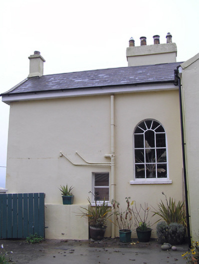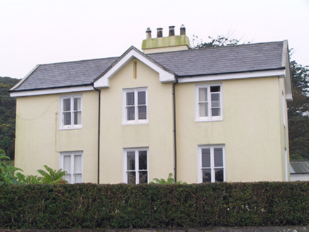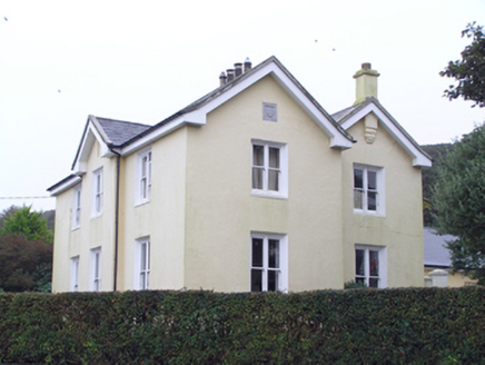 Detached irregular-plan three-bay two-storey former glebe house, built c. 1870, having gabled breakfront to centre of front (north-east) elevation, double pile roof forming M-profile east and west side elevations, rear (south-west) block being slightly recessed on either side, and slightly projecting gabled return to south-east side of rear elevation, with three-bay single-storey extension to this return. Now in use as house. Pitched slate roofs with rendered chimneystacks and cast-iron rainwater goods. Smooth rendered walls with cut limestone plaque to north-west elevation. Square-headed openings with bipartite one-over-one pane timber sliding sash windows to front, north-west and south-east elevations, fixed timber window and glazed timber French doors to south-east elevation and replacement uPVC windows to rear elevation. Round-headed opening with timber fixed spoked window to rear elevation. Square-profile rendered piers to yard to rear of house. Rubble stone wall with square-profile rendered pier and stile to front of site. Square-profile concrete block piers and entrance walls to site entrance to west.