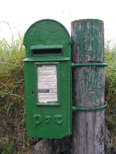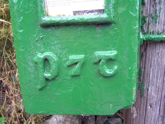 Post-mounted cast-iron round-headed post box, erected c. 1940, with P & T insignia.