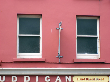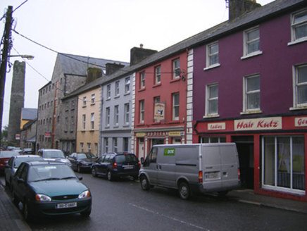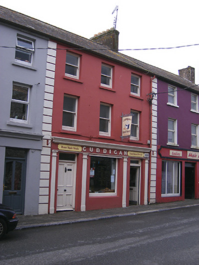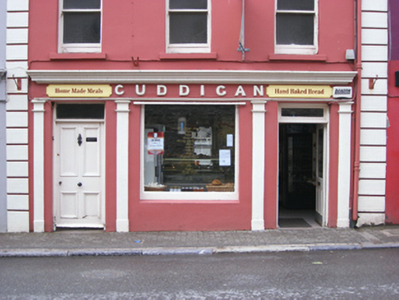 Terraced three-bay three-storey house and shop, built c.1840, with shopfront to ground floor. Pitched slate roof with rendered chimneystack. Painted rendered walls with render quoins. Square-headed openings having one-over-one pane timber sliding sash windows and concrete sills to upper floors. Shopfront comprising Doric pilasters flanking openings having moulded cornice and fascia with raised lettering above. Square-headed opening with plate glass window to central bay flanked by square-headed openings with timber panelled doors and overlights.