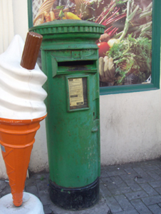 Freestanding cast-iron post box, displaying high quality design and detailing, apparent in the raised lettering and insignia, which enhance its simple form.