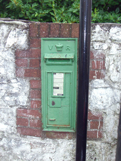 Cast-iron post box, c.1890, with V.R. insignia and crown, set in brick and painted stone wall.