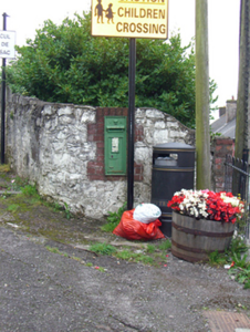 Well-designed post box with raised lettering and crown which enhance its modest form. Cast-iron post boxes such as this are often replaced by modern plastic boxes and are becoming increasing rare throughout Ireland.
