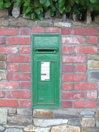 Cast-iron post box, c. 1920, with raised lettering, set in brick wall.