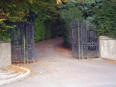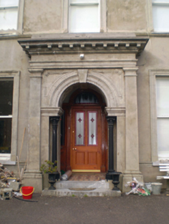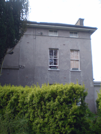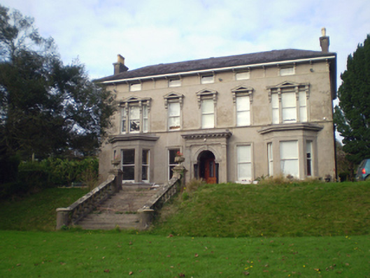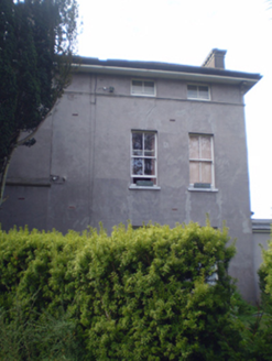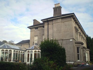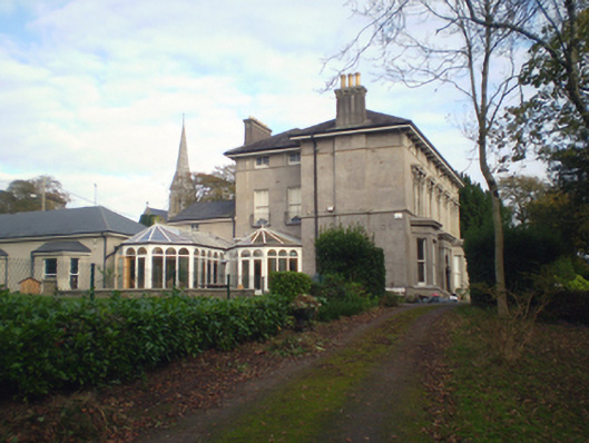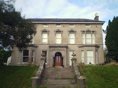 Detached double-pile five-bay two-storey with attic storey house, built c. 1890, with portico and canted bay windows to front (south) elevation, hipped-roofed rear (north) block. Recent extensions to rear and glazed conservatories to west. Hipped slate roofs with overhanging bracketed eaves, rendered chimneystacks and cast-iron rainwater goods. Flat roofs to bay windows with render cornices. Glazed roofs to conservatories. Rendered walls with render plinth course. Square-headed openings throughout, those to attic storey with fixed timber windows, render surrounds and render sill course, those to first floor, tripled to outer bays, with one-over-one pane timber sliding sash windows, render sill course and render surrounds comprising pilasters, consoles and pediments, those to ground floor with one-over-one pane timber sliding sash windows, cut limestone sills and render surrounds. One-over-one pane timber sliding sash windows to bay windows and continuous cut limestone sill courses. Openings to rear and east and west with two-over-two pane timber sliding sash windows, one having bipartite margin sash coloured glass timber sash window with fixed pane coloured glass windows above. Round-headed opening to rear with fixed pane window with round-headed tracery and metal sill guard. Round-headed door opening with timber panelled door, coloured glass fanlight above and timber doorcase. Portico comprising round arch with render keystone and imposts supported by engaged columns on octagonal plinths in turn flanked by render pilasters with render architrave, frieze and dentilated cornice. Tiled threshold with cut limestone steps. Flight of rendered steps to front with render balustrades and circular-profile and square-profile piers. Cast-iron piers and double-leaf gates to site entrance.