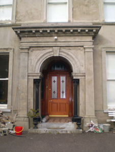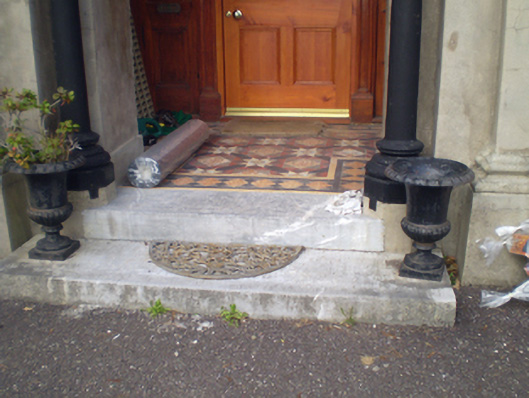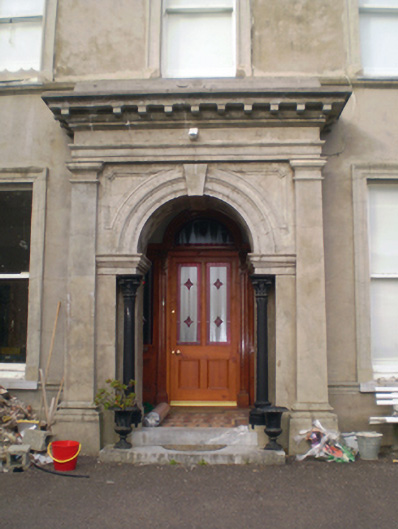 Substantial size and regular façade enlivened by classically inspired features such as pediments and portico. Retains notable features and materials which enhance appearance such as tiled threshold, timber sash windows, coloured glass and slate roof. Retains much of its original form including portico and bay windows, which add to symmetry of façade. Site enhanced by render steps and cast-iron gates.