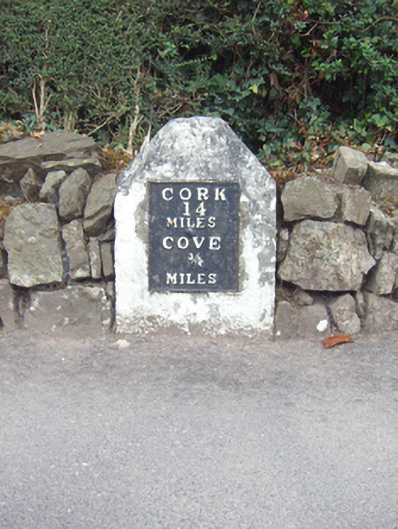 A milestone making a pleasing, if largely inconspicuous visual statement on the side of the road. The cast-iron plaque is embossed: "CORK/14/COVE/¾/MILES".