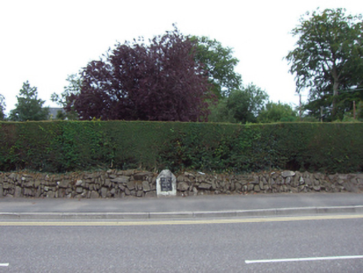 Freestanding cut-limestone milestone, c.1870, with cast-iron plaque. Road fronted in rubble stone boundary wall.