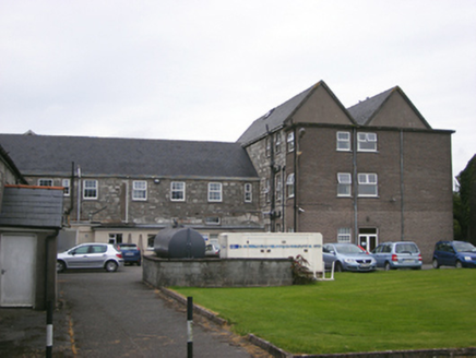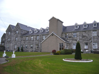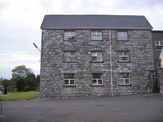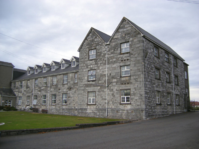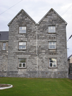 Detached fourteen-bay two-storey with dormer attic former workhouse, built c. 1840. Comprising paired single-bay three-storey gabled end-bays to north and south elevations and recent extension to front (west) elevation. Pitched artificial slate roofs. Dressed limestone walls with plinth course. Square-headed openings having replacement uPVC windows and limestone sills. Square-headed openings with replacement uPVC doors.