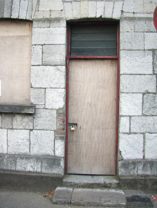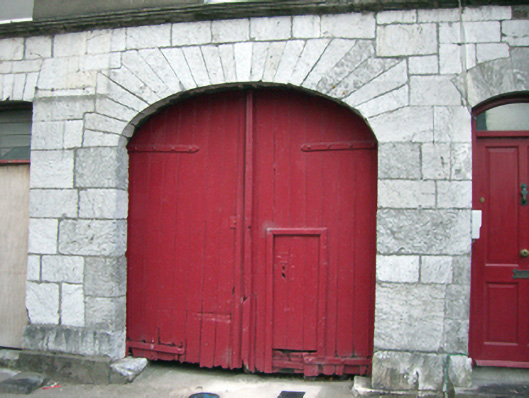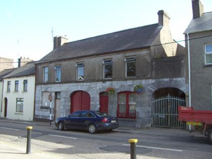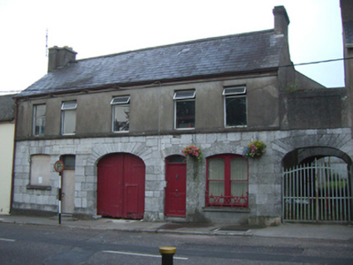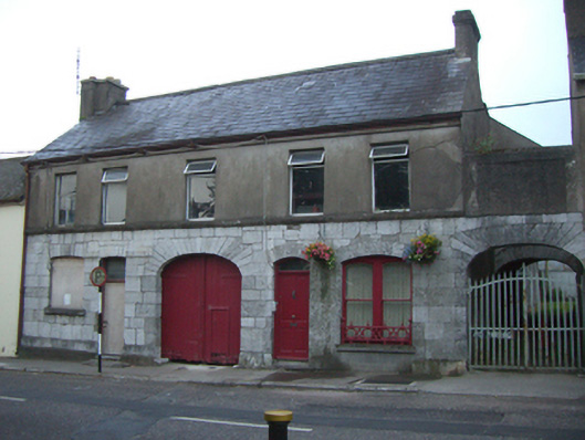 Attached former pair of two-bay houses with shared integral carriage arch bay, built c. 1840, with second carriage arch attached to south. Now disused. Pitched slate roof with rendered chimneystacks and render eaves course. Rendered walls to first floor, snecked limestone walls with limestone plinth course to ground floor. Square-headed openings to first floor with replacement uPVC windows and moulded render continuous sill course. Camber-headed window openings with limestone voussoirs and sills to ground floor, blocked to north end, and having cast-iron sill guard and bipartite one-over-one pane timber sliding sash windows to south end. Camber-headed openings having overlights and timber panelled doors. Limestone thresholds to entrances. Elliptical-headed integral carriage arches with limestone voussoirs. Timber battened double-leaf doors to integral arch. Double-leaf cast-iron gates to southern carriage arch.