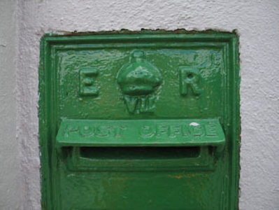 Wall-mounted cast-iron post box, c.1905, with Edward VII crown and royal insignia. Rectangular aperture and display panel. Set in entrance sweep walls.