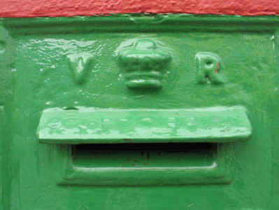 Cast-iron wall-mounted post box, c.1890, with V.R. insignia and raised crown motif. Rectangular aperture and display panel. Set into wall of commercial premises at corner of Barrack Street and Main Street.