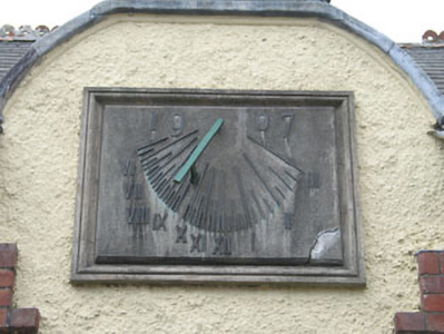 Attached five-bay single-storey house with dormer attic, dated 1907. Pitched slate roof with decorative ceramic ridge tiles, cast-iron rainwater goods, carved timber barge boards (south-west) and finials to gables and tall dog-tooth coursed red brick cylindrical chimney stack with ceramic pot set on curved gablet to south-east elevation. Painted roughcast rendered walls having render sundial plaque to curved gablet. Camber-headed window openings having painted concrete sills, red brick block-and-start surrounds and shouldered label mouldings with replacement uPVC casement windows. Camber-headed opening to entrance with red brick block-and-start surround and shouldered label moulding with replacement timber panelled door and overlight with limestone step.