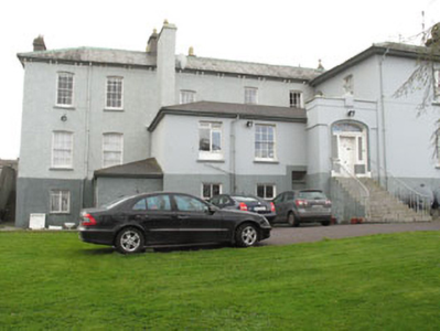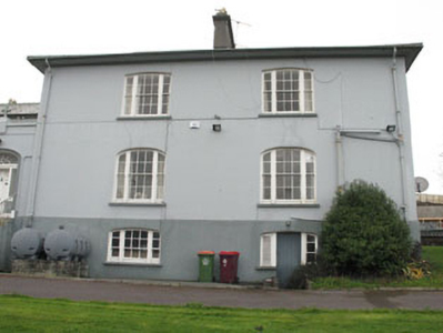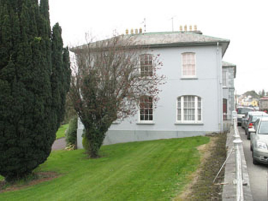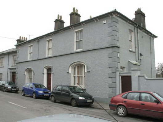 Detached three-bay two-storey parochial house over basement, built c.1880, with later single, two and three storey extensions (north). Hipped slate roofs having rendered chimneystacks with cast-iron and uPVC rainwater goods. Decorative corbelling to later two-storey extension. Painted rendered walls with plinth. Roughcast rendered walls to later extensions with rusticated quoins, sill course to first floor (east) and smooth rendered platband. Camber-headed openings with six-over-six timber sliding sash windows. Camber-headed openings having tripartite six-over-six timber sliding sash windows with flanking two-over-two timber sliding sash windows. Camber-headed tripartite openings to rear (west) with six-over-three timber sliding sash windows and flanking two-over-one timber sliding sash windows. Square-headed openings to first floor of extension with two-over-two timber sliding sash windows. Camber-headed tripartite openings to ground floor of extension having two-over-two and flanking one-over-one timber sliding sash windows with label mouldings. Stone sills throughout. Square-headed door opening with replacement timber panelled door, glass and timber sidelights and overlights. Fluted pilasters to surround with capitals supporting frieze and cornice with blind oculus and cross motif. Recessed camber-headed door opening to rear with timber panelled door, fanlight, smooth and roughcast rendered flanking panels and moulded surround. Cut block limestone stepped approach. Camber-headed door opening to extension with replacement timber panelled door, overlight, chamfered surround and label moulding. Roughcast and smooth rendered boundary wall with cast-iron floral motif railings and double-leaf gate with cast-iron piers (south).