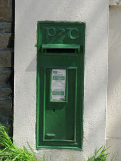 Wall-mounted cast-iron post box, c.1940, with P&T and manufacturer’s insignia. Set into boundary wall of former glebe house on Market Street.