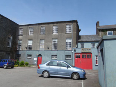 Attached three-bay two-storey over basement town hall with pair of flanking projecting three-bay single-storey over basement flanking wings, built 1862, with five-bay three-storey elevation to rear (south). Two-bay two-storey block to side (east). Bow-fronted end-bay to western end of front elevation having six-bay two-storey return to rear (south) with corrugated-iron addition to side (east) and single-storey lean-to to rear (south). Hipped slate roof to main block having render parapet to front elevation with corbelled cornice and architrave concealing gutters. Flat bitumen roofs to breakfronts having rendered parapets with dentilated cornice. Hipped slate roof to rear return having timber clad eaves course and cast-iron rainwater goods. Rendered walls with quoins to front elevation of main block having moulded rendered sill bands, leaf and vine decoration to first floor band. Rendered pilasters on ashlar limestone plinth to projecting bays having foliated capitals surmounted by rendered architrave and frieze. Rendered and roughcast rendered walls to side and rear elevations, with sections of rubble stone to rear and side (east) elevations of return. Round-headed window openings with render sills to ground floor of front elevation and breakfront bays. Moulded render archivolts and surrounds having pilaster decorations and one-over-one pane timber sliding sash windows to projecting bay openings. Bipartite timber-framed windows to main block, having oculus and tracery over one-over-one pane timber sliding sash windows, colonette detailing to mullions and frame margins. Camber-headed window openings to front elevation of main block at first floor level having moulded render surrounds with lozenge detailing and bipartite timber-framed windows having one-over-one pane timber siding sash windows. Square-headed window openings with render sills to bow-ended bay having bipartite timber casement windows. Square-headed window openings with stone sills to side (west) elevation of side return at ground floor, having replacement six-over-six pane timber sliding sash windows. Round-headed window openings with stone sills to first floor of side (east, west) elevations having replacement six-over-six pane timber sliding sash windows with fanlights to upper sashes. Square-headed window openings with stone sills to rear elevation at ground floor having replacement two-over-two pane timber sliding sash windows. Diminishing square-headed window openings with stone sills to rear elevation of main block, having four-over-four pane timber sliding sash windows to ground floor, twelve-over-twelve pane timber sliding sash windows to first floor and eight-over-eight pane timber sliding sash windows to second floor. Square-headed window openings to two-storey side block having six-over-six pane timber sliding sash windows. Square-headed window openings to corrugated-iron addition having fixed timber-framed single-pane Perspex windows. Round-headed door opening to front elevation having panelled render surround and archivolt, replacement timber panelled door and side panels surmounted by spoked fanlight. Dressed limestone stepped approach to front having recent concrete ramp to side. Opposing square-headed door openings to side (east, west) elevations of projecting bays having moulded render surrounds and replacement single and double-leaf timber battened doors. Square-headed door openings to rear having replacement timber battened doors. Square-headed door opening to rear elevation of two-storey block having double-leaf glazed timber doors.