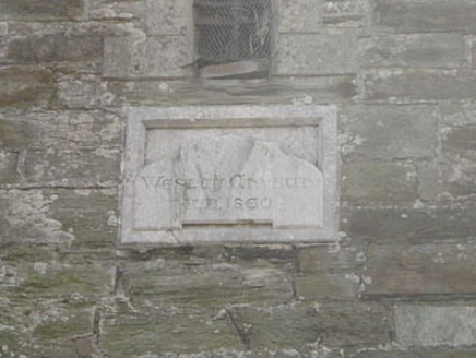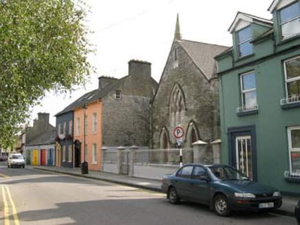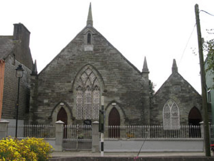 Attached gable-fronted three-bay double-height Methodist church, dated 1860, with attached gable-fronted two-bay single-storey former school to side (west). Recent lean-to additions to rear (south). Pitched slate roofs having tooled limestone gable copings and cast-iron rainwater goods. Ashlar limestone pinnacles to apexes of gables and corner-sited buttresses to front elevation of main block. Dressed snecked limestone walls with plinth, having rendered wall to rear elevation and inscribed limestone date plaques to front (north) elevations. Pointed arch window openings with chamfered limestone block-and-start surrounds, sills and voussoirs to front elevations, having rendered label moulding to front elevation of former school. Tripartite ashlar limestone reticulated tracery with quarry-glazed windows to main block. Bipartite ashlar limestone reticulated tracery with quarry-glazed windows to former school block. Oculus window opening to rear elevation, having timber-framed stained glass window. Pointed arch door opening to front elevation of main block, having chamfered limestone block-and-start surround, voussoirs and label moulding having double-leaf timber battened doors, timber battened tympanum and limestone threshold. Pointed arch door opening with dressed limestone voussoirs to front elevation of former school, having double-leaf timber battened doors and rendered threshold. Rendered enclosing wall with tooled limestone copings and cast-iron railings to north having tooled limestone square-profile gate piers with chamfered corners, pointed caps carrying single and double-leaf cast-iron gates.