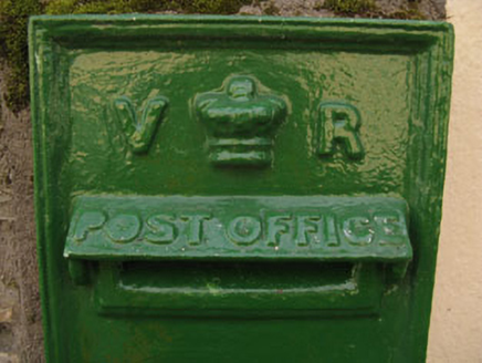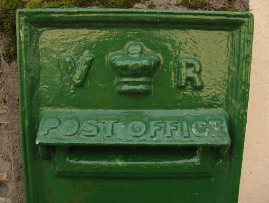 Wall-mounted cast-iron post box, installed c.1890, having raised lettering including V.R. royal cipher and insignia, set in rubble stone wall.