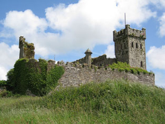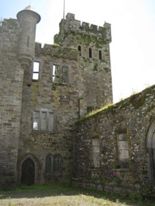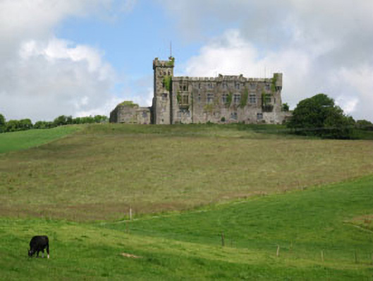 Detached multiple period castle, comprising medieval, eighteenth, nineteenth and twentieth century fabric. Seven-bay three-storey block forming southern range, built c.1750, incorporating medieval tower house, Gothicized 1871, with the addition of corner turrets, crenellations and perron with inset arches and dovecote leading to entrance at first floor level, having machicolation above. Three-stage block attached to west, with four-stage tower with crenellations, c.1830, to west corner. Five-bay single-storey wing and remains of tower running from west corner to north, forming western range. Burnt and partly rebuilt in early twentieth century. Pitched slate roof to southern range. Crenellated parapets set on string course with carved corbels. Roughly dressed and rubble stone walls. Carved crest to machicolation. Square-headed window openings to front (north), side (east) and rear (south) elevations of southern range and linking tower (north). Dressed stone voussoirs to window openings of front elevation, having tooled stone mullions and transoms to first and second floor windows creating single, double and four-light arrangements. Canted bay windows with dressed stone surrounds, mullions, transoms and corbelled bases to first and second floors south elevation of linking tower. Single- and double-light window openings to ground floor of rear elevation, including one single-light opening, now blocked. Lead-lined lattice work windows. Guardrobe openings to first floor of side (east) elevation and ground floor of rear elevation. Cruciform gun loops to first floor of front elevation. Square-headed loop window openings to bartizan. Tudor arch window openings to rear elevation at ground floor of linking tower, having tooled stone surrounds. Paired lancet window openings to ground floor of front and rear elevations (north, south) with tooled stone surrounds and mullions. Lancet window openings with tooled stone surrounds to first and second stages of corner tower. Lancet window openings to ground floor (west, south) with tooled and dressed surrounds and hood mouldings. Double-light square-headed window opening to rear elevation of first floor. Pointed arch door openings to ground and first floors of front elevation of southern range, ground floor of linking tower (north), front elevation of western range (east) and south elevation of western range. Dressed stone door surrounds and hood mouldings. Dressed stone voussoirs surmounting door openings to front elevation of south range. Reinforced timber battened doors throughout. Recent steel door to linking tower. Square-headed rendered recesses to front (west) elevation of western range, having stone sills. Rubble stone enclosing walls to north with carriage openings to avenue (north) and outbuildings (north-east), having tooled and dressed stone gate piers. Flanking round-headed recesses to main entrance gate with stone sills having dressed impost and keystones. Bawn wall with remains of tower to south-east corner. Outbuildings to north-east.