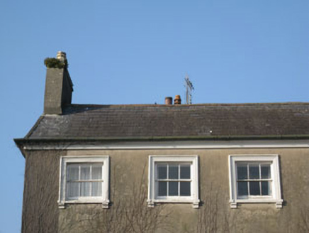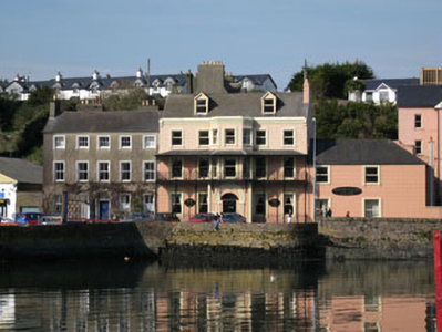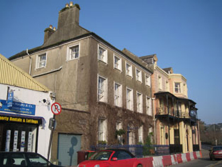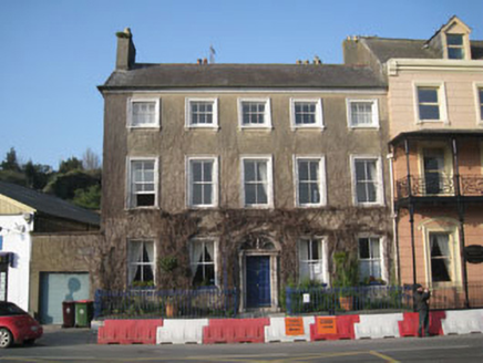 Semi-detached five-bay three-storey Georgian house, built c.1800, now in use as guest house. Additional three-bay two-storey block to rear (north-east), having single-bay two-storey lean-to extension. Recent extension to side (north-west). Pitched slate roofs with terracotta ridge tiles, cast-iron rainwater goods, rendered chimneystacks and render eaves course. uPVC rainwater goods to side of house and rear of additional block and extension. Rendered walls. Square-headed window openings with moulded render surrounds, painted stone sills over render corbels to front (south-west) and side (north-west) elevations. Diminishing window openings to front. Two-over-two pane timber sliding sash windows to ground and first floors, three-over-three pane windows to second floor. Square-headed window openings to rear of additional block with stone sills, having six-over-six and three-over-three pane timber sliding sash windows. Round-headed door opening to front elevation within decorative tooled limestone doorcase comprising engaged Doric columns, frieze and cornice. Timber panelled door with overlight. Tooled limestone stepped approach flanked by ashlar limestone plinths to street front with cast-iron spear-headed railings. Outbuilding with chimney to rear, now ruinous. Located on main street with views over harbour.